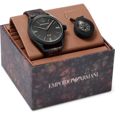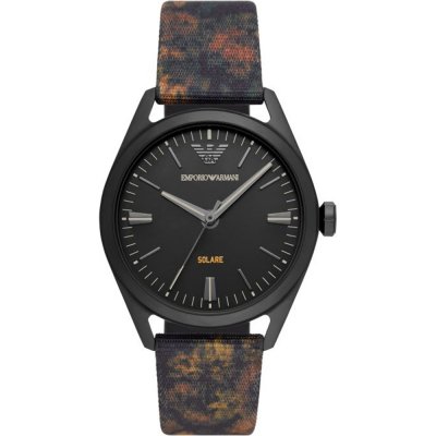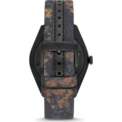 This Emporio Armani watch has a case made of stainless steel with a diameter of 41 mm and is fitted with a Textile over leather band. Inside the case lies a Seiko movement and the watch features a Mineral crystal.