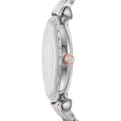 This Emporio Armani watch has a case made of stainless steel with a diameter of 28 mm and is fitted with a stainless steel band. Inside the case lies a Miyota movement and the watch features a Mineral crystal.