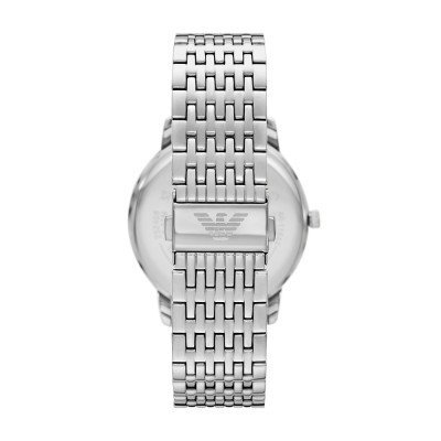 This Emporio Armani watch has a case made of stainless steel with a diameter of 42 mm and is fitted with a stainless steel band. Inside the case lies a Miyota movement and the watch features a Mineral crystal.