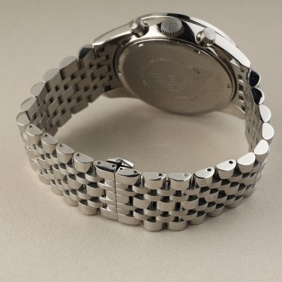 This Emporio Armani watch has a case made of stainless steel with a diameter of 46 mm and is fitted with a stainless steel band. Inside the case lies a Seiko Instruments Inc. movement and the watch features a Mineral crystal.