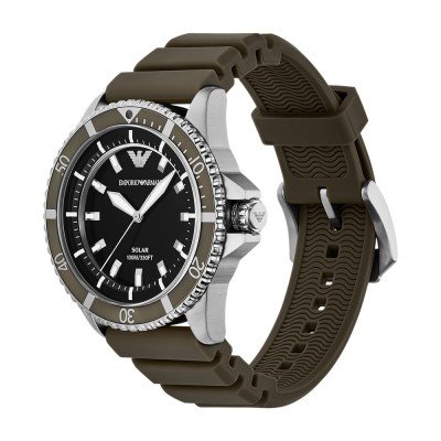 This Emporio Armani watch has a case made of stainless steel with a diameter of 42 mm and is fitted with a rubber band. Inside the case lies a Miyota movement and the watch features a Mineral crystal.