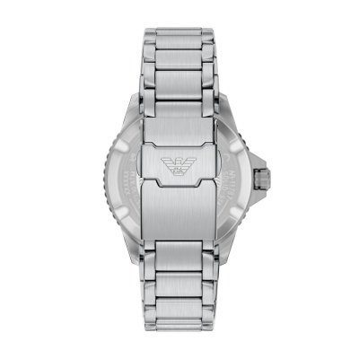 This Emporio Armani watch has a case made of stainless steel with a diameter of 42 mm and is fitted with a stainless steel band. Inside the case lies a Miyota movement and the watch features a Mineral crystal.