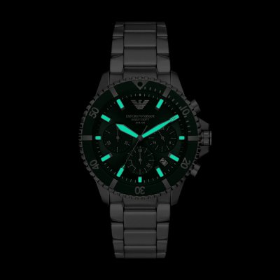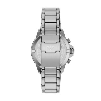 This Emporio Armani watch has a case made of stainless steel with a diameter of 43 mm and is fitted with a stainless steel band. Inside the case lies a Seiko movement and the watch features a Mineral crystal.
