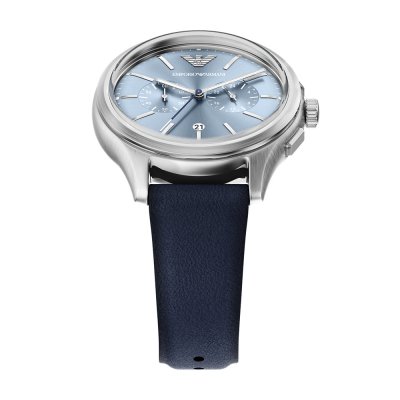 This Emporio Armani watch has a case made of stainless steel with a diameter of 42 mm and is fitted with a leather band. Inside the case lies a Miyota movement and the watch features a Mineral crystal.