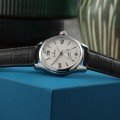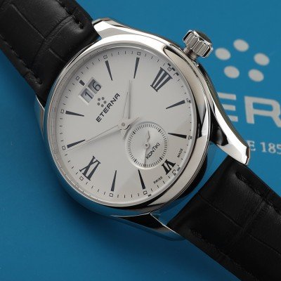 This Eterna watch has a case made of stainless steel with a diameter of 36 mm and is fitted with a leather band. Inside the case lies a Ronda movement and the watch features a Sapphire crystal.