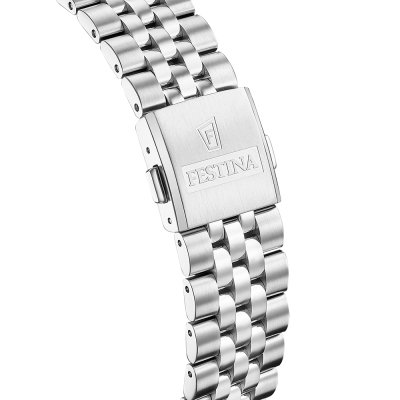 This Festina watch has a case made of stainless steel with a diameter of 41 mm and is fitted with a stainless steel band. Inside the case lies a Soprod movement and the watch features a Sapphire crystal.