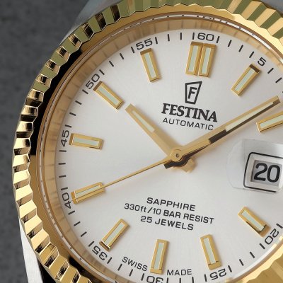 This Festina watch has a case made of stainless steel with a diameter of 41 mm and is fitted with a stainless steel band. Inside the case lies a Soprod movement and the watch features a Sapphire crystal.