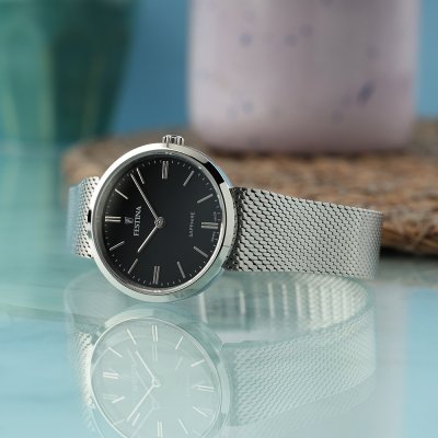 This Festina watch has a case made of stainless steel with a diameter of 29 mm and is fitted with a stainless steel band. Inside the case lies a Ronda movement and the watch features a Sapphire crystal.