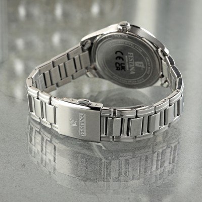 This Festina watch has a case made of stainless steel with a diameter of 37 mm and is fitted with a stainless steel band. Inside the case lies a Ronda movement and the watch features a Sapphire crystal.