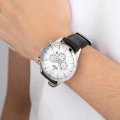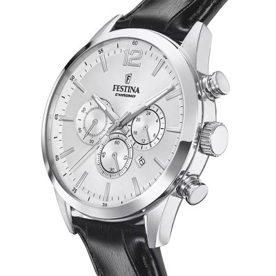 This Festina watch has a case made of stainless steel with a diameter of 43 mm and is fitted with a leather band. Inside the case lies a Miyota movement and the watch features a Mineral crystal.
