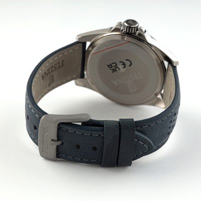 This Festina watch has a case made of titanium with a diameter of 43 mm and is fitted with a leather band. Inside the case lies a Miyota movement and the watch features a Mineral crystal.