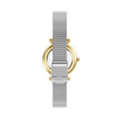 This Fossil watch has a case made of stainless steel with a diameter of 28 mm and is fitted with a stainless steel band. Inside the case lies a Seiko Instruments Inc. movement and the watch features a Mineral crystal.