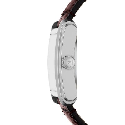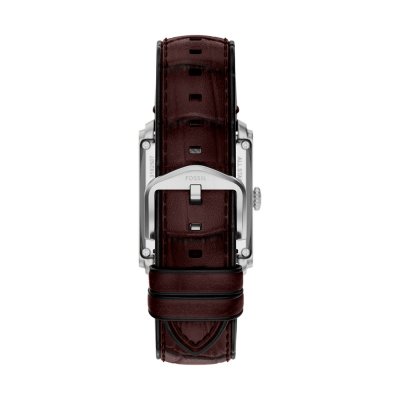 This Fossil watch has a case made of stainless steel with a diameter of 30 mm and is fitted with a leather band. Inside the case lies a Miyota movement and the watch features a Mineral crystal.