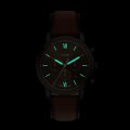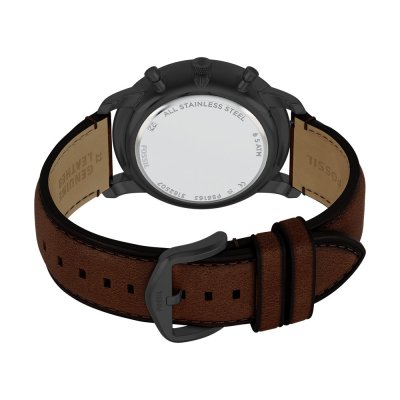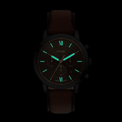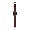 This Fossil watch has a case made of stainless steel with a diameter of 44 mm and is fitted with a leather band. Inside the case lies a Miyota movement and the watch features a Mineral crystal.