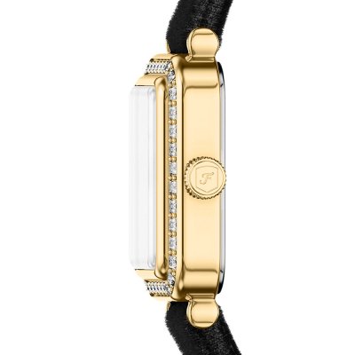 This Fossil watch has a case made of stainless steel with a diameter of 18 mm and is fitted with a Textile over leather band. Inside the case lies a Seiko movement and the watch features a Mineral crystal.