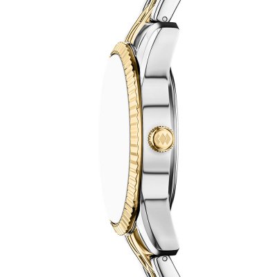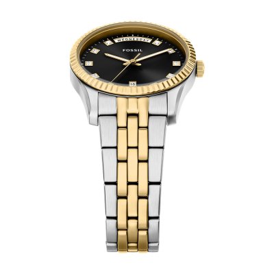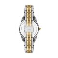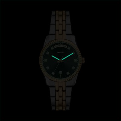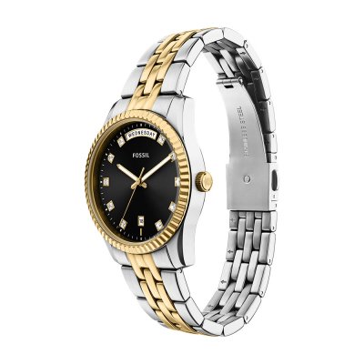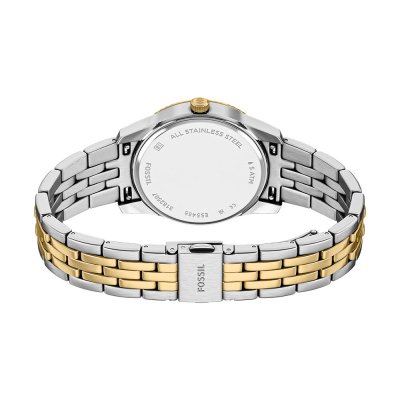 This Fossil watch has a case made of stainless steel with a diameter of 34 mm and is fitted with a stainless steel band. Inside the case lies a Seiko Instruments Inc. movement and the watch features a Mineral crystal.