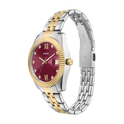 This Fossil watch has a case made of stainless steel with a diameter of 32 mm and is fitted with a stainless steel band. Inside the case lies a Miyota movement and the watch features a Mineral crystal.