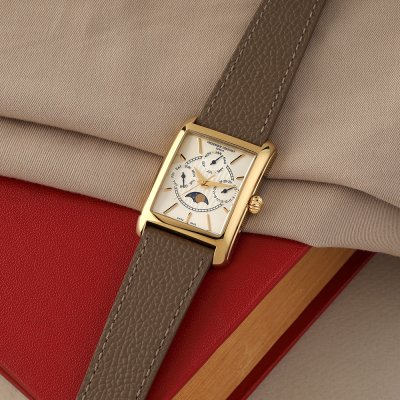The Frederique Constant Classics Carrée Moonphase watch, is a refined and exceptional timepiece with multiple functions. The FC-265 quartz movement shows hours, minutes, seconds, as well as the date, day, month and moon phase, with an impressive 60-month battery life. All this is encased in a rectangular 42.30 x 30 mm case, made in polished yellow gold-plated stainless steel. The silver dial with sunburst finish and an embossed pattern in the center, is offset by gold-plated indexes and hands, offering perfect readability.