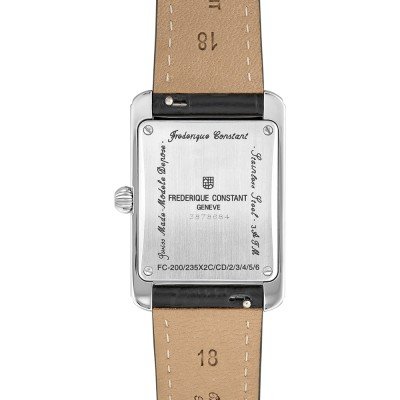 The design of the Frederique Constant Classics Carrée was inspired by the Art Deco movement of the 1920s and 1930s, with its straight, taut lines and elaborate geometric shapes. A style that - in a hundred years - has lost none of its appeal and remains popular among design and watch enthusiasts. The hour and minute hands tick along a "sector dial," also known as ‘railway track’, so typical of the era. An independent small seconds hand is inserted at 6 o'clock with a slight hollow plane. Another ‘Deco’ design element is the onion shaped crown, a tribute to the pocket watches that this type of wristwatch was slowly replacing as the everyday watch for everyone. As classic as the style is, underneath lies a modern Swiss FC-235 (based on Ronda 1064) movement for ultimate accuracy.
