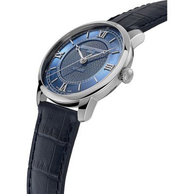 The Classics Premiere watch is a perfect blend of tradition and modern elegance. Roman numeral applied hour markers and Breguet hands emphasize the classic style of the watch. The sunburst minute circle and central section decorated with a fine guilloche pattern underscore the watches modernity and bring depth and texture. The watch is powered by an FC-301 (based on a G100 La Joux-Perret) movement, which offers a 68-hour power reserve. Through the transparent caseback, you can admire the Côtes de Genève pattern adorning the rotor. With a diameter of just 38.5 mm the Premiere is aimed at men, but we are sure this watch will appeal to ladies as well.