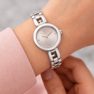 This Furla watch has a case made of stainless steel with a diameter of 24 mm and is fitted with a stainless steel band. Inside the case lies a Miyota movement and the watch features a Mineral crystal.