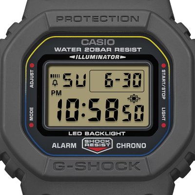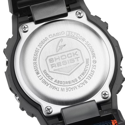 This G-Shock watch has a case made of Bio-sourced resin with a diameter of 42.8 mm and is fitted with a textile band. Inside the case lies a Casio movement and the watch features a Mineral crystal.