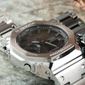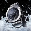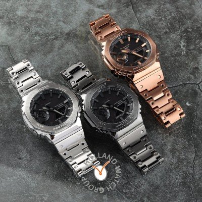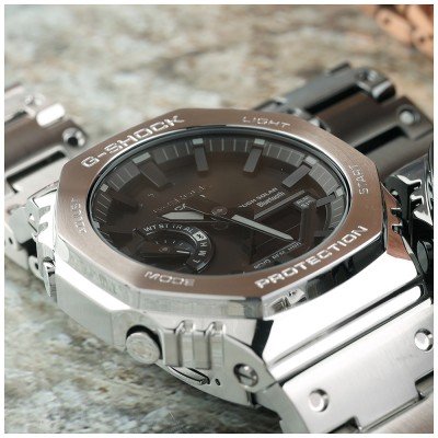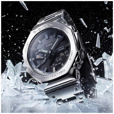 This G-Shock watch has a case made of stainless steel with a diameter of 44.4 mm and is fitted with a metal band. Inside the case lies a Casio movement and the watch features a Mineral crystal.
