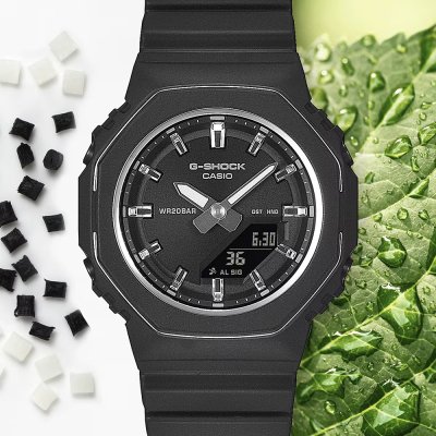 This G-Shock watch has a case made of Bio-sourced resin with a diameter of 40.2 mm and is fitted with a Bio-sourced resin band. Inside the case lies a Casio movement and the watch features a Mineral crystal.