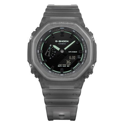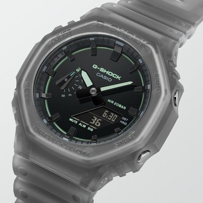 This G-Shock watch has a case made of Bio-sourced resin with a diameter of 45.4 mm and is fitted with a Bio-sourced resin band. Inside the case lies a Casio movement and the watch features a Mineral crystal.