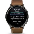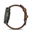 This Garmin watch has a case made of Fibre-reinforced Resin with a diameter of 45 mm and is fitted with a leather band. Inside the case lies a Garmin movement and the watch features a Corning Gorilla Glass 3 crystal.