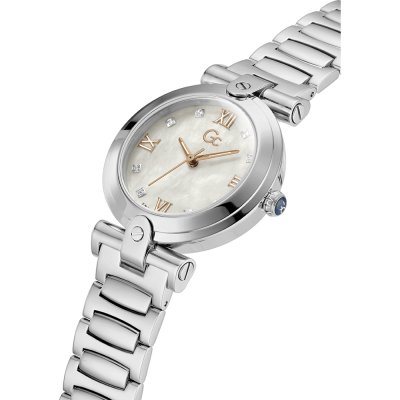 This GC watch has a case made of stainless steel with a diameter of 34 mm and is fitted with a metal band. Inside the case lies a Ronda movement and the watch features a Sapphire coated mineral crystal.