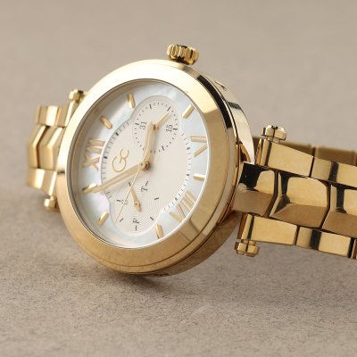 This GC watch has a case made of stainless steel with a diameter of 36.5 mm and is fitted with a stainless steel band. Inside the case lies a Ronda movement and the watch features a Sapphire coated mineral crystal.