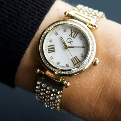 This GC watch has a case made of stainless steel with a diameter of 32 mm and is fitted with a metal band. Inside the case lies a Ronda movement and the watch features a Sapphire coated mineral crystal.