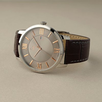 This GC watch has a case made of stainless steel with a diameter of 40 mm and is fitted with a leather band. Inside the case lies a Ronda movement and the watch features a Mineral crystal.
