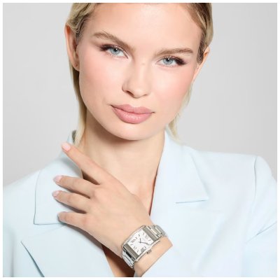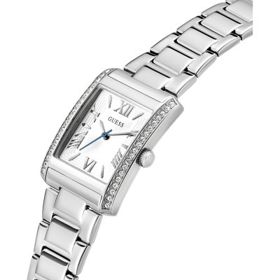 This Guess watch has a case made of stainless steel with a diameter of 27 mm and is fitted with a stainless steel band. Inside the case lies a Seiko movement and the watch features a Mineral crystal.