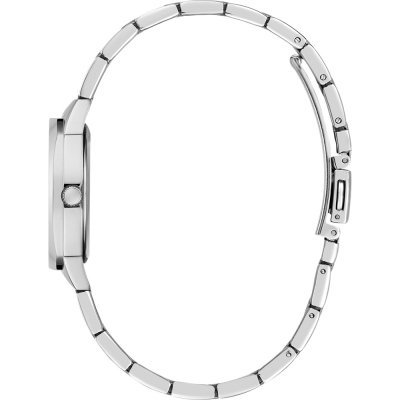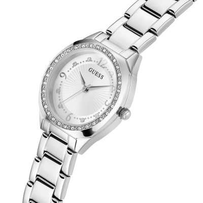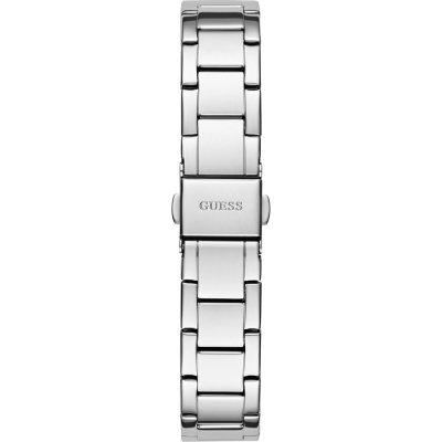This Guess watch has a case made of stainless steel with a diameter of 30 mm and is fitted with a stainless steel band. Inside the case lies a Seiko movement and the watch features a Mineral crystal.