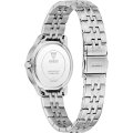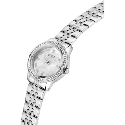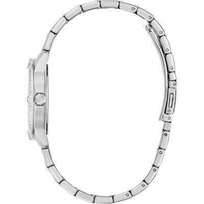 This Guess watch has a case made of stainless steel with a diameter of 32 mm and is fitted with a stainless steel band. Inside the case lies a Seiko movement and the watch features a Mineral crystal.