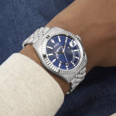 This Guess watch has a case made of stainless steel with a diameter of 42 mm and is fitted with a stainless steel band. Inside the case lies a Seiko Instruments Inc. movement and the watch features a Mineral crystal.