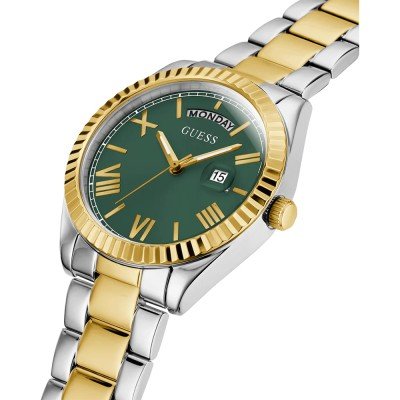 This Guess watch has a case made of stainless steel with a diameter of 36 mm and is fitted with a stainless steel band. Inside the case lies a Seiko Instruments Inc. movement and the watch features a Mineral crystal.