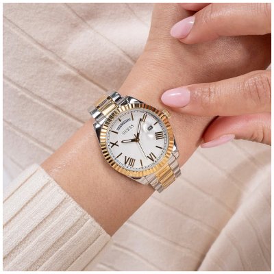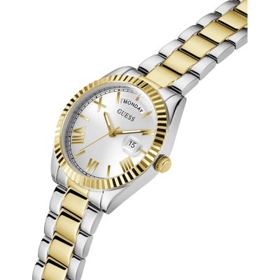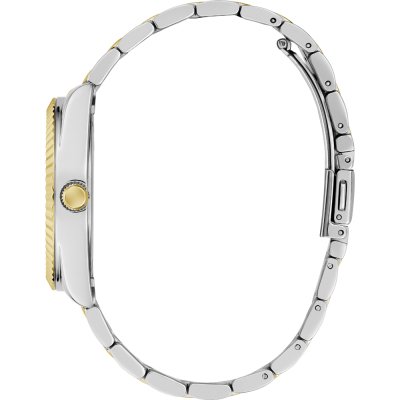 This Guess watch has a case made of stainless steel with a diameter of 36 mm and is fitted with a stainless steel band. Inside the case lies a Seiko Instruments Inc. movement and the watch features a Mineral crystal.