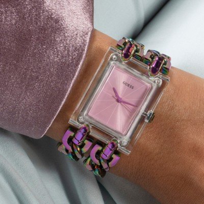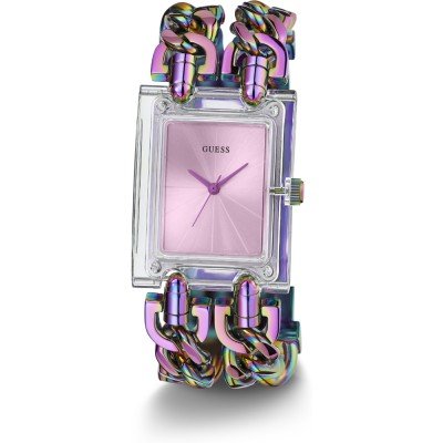 This Guess watch has a case made of stainless steel with a diameter of 29 mm and is fitted with a stainless steel band.
