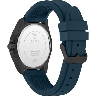 This Guess watch has a case made of stainless steel with a diameter of 42 mm and is fitted with a rubber band. Inside the case lies a Seiko movement and the watch features a Mineral crystal.