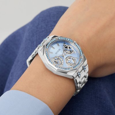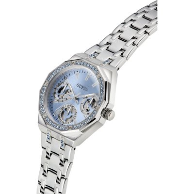 This Guess watch has a case made of stainless steel with a diameter of 36 mm and is fitted with a stainless steel band. Inside the case lies a Seiko Instruments Inc. movement and the watch features a Mineral crystal.