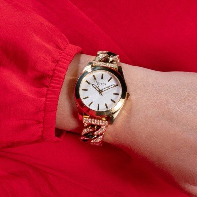 This Guess watch has a case made of stainless steel with a diameter of 32 mm and is fitted with a stainless steel band. Inside the case lies a Seiko movement and the watch features a Mineral crystal.