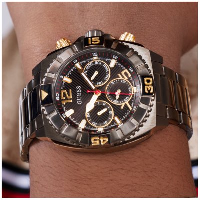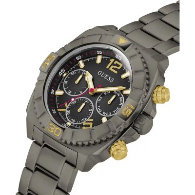 This Guess watch has a case made of stainless steel with a diameter of 44 mm and is fitted with a stainless steel band.