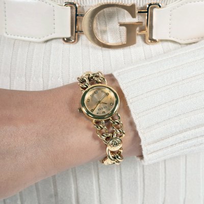 This Guess watch has a case made of stainless steel with a diameter of 25 mm and is fitted with a stainless steel band.