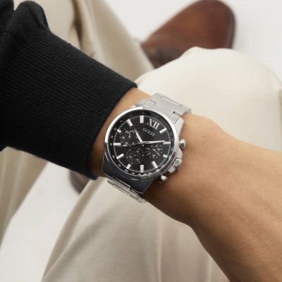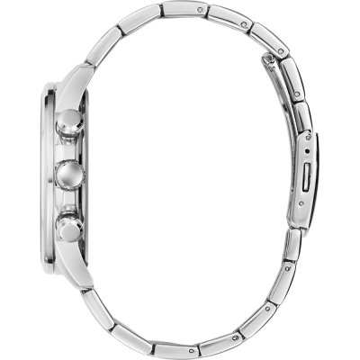 This Guess watch has a case made of stainless steel with a diameter of 44 mm and is fitted with a stainless steel band. Inside the case lies a Seiko Instruments Inc. movement and the watch features a Mineral crystal.