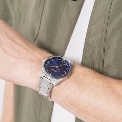 This Hugo Boss watch has a case made of stainless steel with a diameter of 41 mm and is fitted with a stainless steel band. Inside the case lies a Seiko movement and the watch features a Mineral crystal.