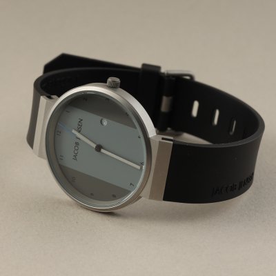 This Jacob Jensen watch has a case made of stainless steel with a diameter of 35 mm and is fitted with a rubber band.