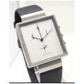 This Jacob Jensen watch has a case made of stainless steel with a diameter of 32 mm and is fitted with a leather band. Inside the case lies a ETA movement and the watch features a Sapphire crystal.